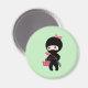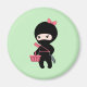 Mignonne caricature ninja fille habillée en noir mais pour un arc rose sur son masque de tête. L’épée katana japonaise traditionnelle peut être vue attachée sur son dos, sa poignée est également rose. La fille tient un panier rose.