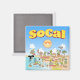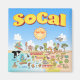 Un dessin de la Californie du Sud - présentant Los Angeles, Anaheim, Long Beach, San Diego. Des personnages de dessins animés de toutes sortes nagent et se baladent et jouent sous le soleil de Californie brillant au-dessus de tout.