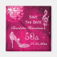 Elégant, glamour 50e anniversaire / Cinquantième anniversaire Magnet Réservez la date. Un éblouissement branché et glamour Sauvez les dates pour vos célébrations du 50e / 50e anniversaire. Magnifique, éblouissant argent scintille diamants bijoux bling image de la note musicale, funky rose rétro boule miroir disco et argent glittery stiletto talon haute image de chaussures de mode sur un arrière - plan chic rose chaud. Un mignon, classe, à la mode, élégant, joli enregistrer l'aimant de date pour les femmes. Les femmes adoreront ce design cool, amusant, funky, girly pour leur musique glamour et la danse 50ème/Cinquantième fêtes.