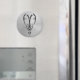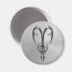 Ce symbole fortement stylisé pour le signe Zodiaque Aries a l'apparence d'être coulé à partir de fer solide. Une ombre tombe sur l'arrière - plan en acier inoxydable qui fait apparaître le symbole flotter juste au-dessus de la surface de cet aimant.
