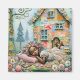 Une jeune fille avec des fleurs colorées dans les cheveux dort paisiblement devant une maison fantaisiste faite de divers morceaux de papier coloré. Des arbres à fleurs et des fleurs fleuries entourent la scène, créant une atmosphère onirique. Photoshop Art numérique CS5
