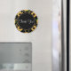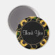 Aimant Merci avec une motif élégante et élégante. Joli tournesol jaune et feuilles verts entourés de fines chaînes d'or. Arrière - plan noir. Un cercle noir avec une fausse bordure dorée superposée avec votre texte à l'intérieur.