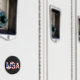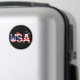 "USA" dans les Stars and Stripes avec des icules et du cristal, un sapin de Noël et un chapeau de Père Noël sur "USA", et des flocons de neige en rouge, blanc et bleu dans l'arrière - plan. Design unique aux Etats-Unis pour les saisons de vacances.