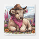 Illustration d'une jolie vache Highland portant un casquette de cow-boy et un bandana, entourée de fleurs sauvages colorés et d'un paysage pittoresque.