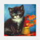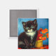 Magnet avec un beau chat Van Gogh tuxedo! Ce petit chaton pose à côté d'un panier de fleurs orange sur une table rouge. Un grand cadeau pour les amoureux de les chats et les collectionneurs d'art hollandais !