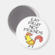 Aimant frigo vegan mignon avec un joli coq de dessin animé rouge, jaune et orange avec la légende Mange fruit pas d'amis en noir toutes les polices manuscrites casquettes.