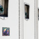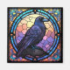 Décoré de vitraux, un corbeau déplaisant éffrayant tourne son regard vers le spectateur.