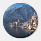 Aimant photo rond avec la ville de Hallstatt couvert de neige au bord du lac de Hallstätter Voir lac avec Alpes montagnes dans l'arrière - plan à la première lumière du lever du soleil dans un paysage d'hiver en Autriche.