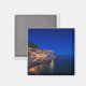 Aimant photo souvenir avec la petite ville de Manarola, l'une des cinq célèbres villages de la colline des Cinque Terre, construite sur une falaise surplombant la mer Méditerranée, avec les lumières allumées pendant l'Heure Bleue au début de la nuit en Ligurie, Italie.