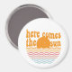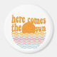 Design rétro avec des vagues amusantes bleu, rose et orange. Texte : "Voici le Soleil".