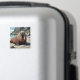 Walrus themed magnet with a cute walrus laying on a sandy beach by the ocean on a sunny day. Background of cliffs and blue ocean waves.