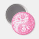 Ce magnifique design de Yin yang comprend deux roses tribaux stylisés. Des tourbillons roses complexes ornent les deux côtés de ce symbole traditionnel, créant ainsi un motif délicat. Les deux fleurs coulent du fond de la goutte de larme de chaque côté avec des feuilles poussant des tiges. Ce Yin yang unique crée un design d'aimant étonnant et élégant.