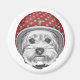 Ce dessin présente le portrait d'un Yorkshire Terrier portant un casque pointillé turquoise et rouge à pois.