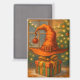 Bring a little enchantment to the holidays with this warm and whimsical illustration. A crooked orange witch hat—complete with a shiny red ornament hanging from its tip—rests playfully atop a festive gift box wrapped in green and orange ribbons. Soft golden lights, a glowing Christmas tree, and a snowy windowsill create a cozy winter atmosphere full of charm and seasonal magic.