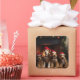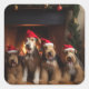 An enchanting scene captures the essence of coziness and holiday spirit as furry companions adorned in Santa Claus hats gather around a crackling fireplace. The warmth emanating from the hearth creates a snug atmosphere for these adorable canines, while festive stockings hang in the background, enhancing the merry ambiance. The charming illustration portrays a timeless image of companionship and festive joy, perfect for celebrating the holiday season with a touch of canine charm.