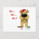 Airedale Terrier trying to get away with eating all of Santa's cookies. Airedale is wearing a Santa Hat, with ginger bread man in his mouth with caption that reads, "Ho... Ho... Ho???"