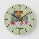 Destei's original cartoon illustration of an adorable Airedale Terrier breed dog's head close-up surrounded by colourful summer wildflowers. There is a blush pink flower, a purple flower, a dark pink flower and a white daisy flower together with some green leaves and branches. The background colour is green with a light polka dot pattern. The background colour can be changed to any other colour and the polka dot pattern can be removed, if so wished. The hours are marked with numbers. The hours and minutes are shown with a dotted clock face. There is also a personalizable text area for a name or other custom text in a lovely script font.