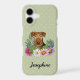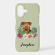 Destei's original cartoon illustration of an adorable Airedale Terrier breed dog's head close-up surrounded by colourful summer wildflowers. There is a blush pink flower, a purple flower, a dark pink flower and a white daisy flower together with some green leaves and branches. The background colour is green with a light polka dot pattern. The background colour can be changed to any other colour and the polka dot pattern can be removed, if so wished. There is also a personalizable text area for a name.