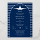 Your favorite pilot getting ready to soar with the eagles? Celebrate your graduate's accomplishment in true aviation style with this real silver foil, blue and white graduation party invitation design by Holiday Hearts Designs. The "Class of" and "Year" text as well as the graduate's name are in silver foil. The dark blue arch is outlined in silver foil and the front background features silver foil and dark blue stripes. The back features a repeat pattern of dark blue airplanes on a white background.