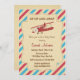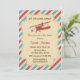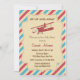Baby shower invitation with airplane design and red and blue airmail stripes background.