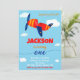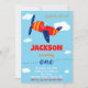 Transportation theme birthday invitation for a boy toddler's first birthday featuring airplane and some clouds in the blue sky around.