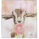 Cool pink Watercolor backdrop showcases this silly little goat with airplane ears - this cute goat in front of pink and yellow watercolor backdrop is blowing a bubble with Bubblegum -