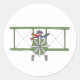 A whimsical plane flying high in the blue sky with clouds all around him.