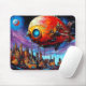 +{ AI Art }+ Colourful steampunk airship hovers over medieval city on another planet.