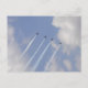 A squadron of military jets performs their manoeuvres among the cumulus clouds above a summer air show.