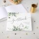 Capture your special day's magic with this elegant wedding guestbook featuring a chic botanical bouquet of light and airy watercolor greenery and eucalyptus leaves complemented with glittery golden speckles (printed).