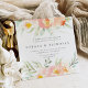 Notre faire-part de mariage floral chic au format carré unique encadre vos détails mariages avec une bordure supérieure et inférieure de fleurs d'aquarelle peintes et de feuillage dans des tons doux de pêche et de vert pastel. Coordonner avec notre mariage aérien et la collection d'événements.
