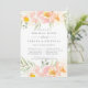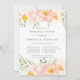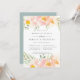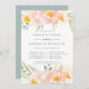 Elegant watercolor floral rehearsal dinner invitation frames your ceremony rehearsal and dinner celebration details with a border of sheer pastel watercolor flowers in light peach and blush pink, with mint green foliage.