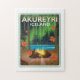 Akureyri Iceland travel poster, featuring a campfire under the beautiful northern lights.