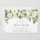 Chic floral baby shower invitation features a top border of ivory roses and white peonies with lush botanical foliage and greenery. Personalize with your baby shower details in modern hand lettered script and traditional sans serif lettering. Invitations reverse to rich jewel toned jasper green.