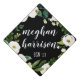 Beautiful grad cap topper features the graduate's name in elegant white calligraphy script, on a black background adorned with white watercolor flowers and green foliage. Personalize with your class year and/or school.