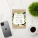 Elegant and modern floral engagement party invitation features a background of ivory roses and peonies with lush green botanicals and foliage with real gold foil trim. Your engagement party details are overlaid on a sheer white element in elegant inky off-black lettering accented with handwritten style calligraphy. A speckled brown kraft background adds rustic charm.