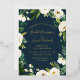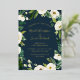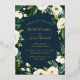 Our Alabaster wedding invitation surrounds your wedding day details with a frame of painted watercolor greenery, botanical foliage and white rose and peony flowers on a rich navy blue background. Your wedding details are displayed in chic gold foil lettering with handwritten accents.