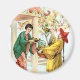 vintage watercolor painting of the fairytale 'aladdin's lamp' with a china man wearing a red hat, long thin hair plait, mustache, yellow coat, and orange trousers, holding a basket full of lamps and holding a lamp up to exchange it with another old lamp held and offered by a lady with ancient japanese hair style, green coat, and pink decorated dress, stepping out of a palace with white columns and curly red roof top,in a pretty garden with a lovely tree with pink and red blossoms. vintage art in pinks and yellows.