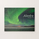 The Aurora Borealis blazes over the Knik River in Alaska. Also has text that reads "Alaska Curtain Call" By Ted Raynor