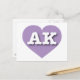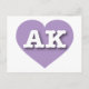 This postcard features a mellow lavender heart containing the bold white upper case letters AK, the official abbreviation for Alaska, the last frontier. The reverse side of the postcard is blank, awaiting your handwritten sentiments or customized text.