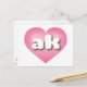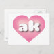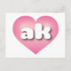 This postcard features a calm, cool, and collected pink heart with a white-washed centre containing the bold, white, rounded, lower case letters ak, a playful abbreviation for the state of Alaska, the last frontier. The reverse side of the card is blank, awaiting your handwritten sentiments or customized text.