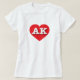 This t-shirt features a vibrant red heart containing the bold white upper case letters AK, the official abbreviation for the state of Alaska.