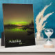 Decorated with an image of the aurora borealis and the lights of the community of Bodenburg Butte reflecting off the Knik River in Alaska. Also has text that says "Alaska Sigh...." By Ted Raynor