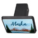 The vast Alaskan Wilderness outdoor scene with wording centred above a waterway in between pine trees with a mountainous background by artist Jason Girard.