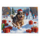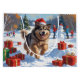 A heartwarming holiday illustration featuring a cheerful dog playing in the snow, wearing a Santa hat and surrounded by colourful gift boxes. In the background, children build a snowman beside a snow-covered Christmas tree, creating a joyful winter wonderland. Perfect for spreading holiday cheer and capturing the magic of Christmas.