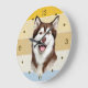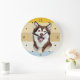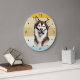A portrait of a beautiful Alaskan Malamute Dog is the feature on this clock. The image is placed on a retro, slightly distressed striped sunset background. Dark gold numbers and diamond shaped markers around the perimeter make the clock easy to read. Perfect for anyone who has lost their heart to a Malamute.