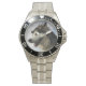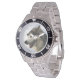 Has heft and feel of expensive stainless steel quartz watches. Good band with safety catch. I removed links, which is easy because engraved arrows show direction to push the linking pins. As always by this seller, the image (a railroad logo) is a perfect reproduction of my emailed image, and is precisely spaced and aligned.