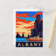 Albany postcard. Motorboat on the Hudson river and skyscrapers behind. Travel postcard in vibrant colours.