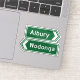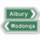 Albury–Wodonga is a twin city area that straddles the border of New South Wales (NSW) and Victoria (VIC). This design features a highway sign for each city pointing in opposite directions.