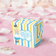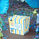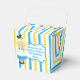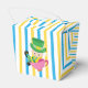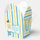 Pretty Alice in Wonderland theme birthday party favour box for a child's birthday. Little girl Alice in her blue dress and the Mad Hatter decorate this beautiful blue and yellow striped box.